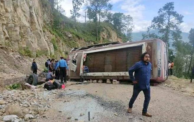 धनकुटाको मध्यसडकमै पल्टियो बस, २३ जना घाइते