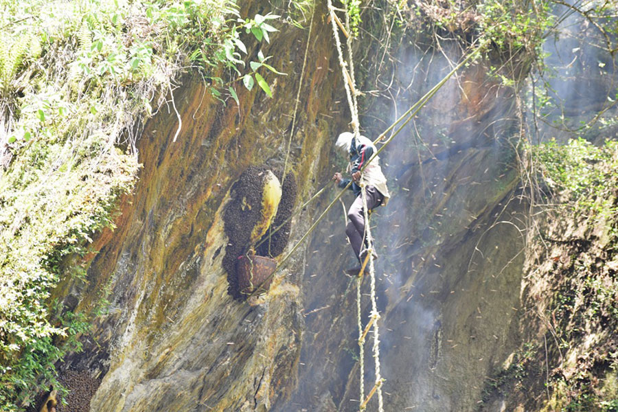 ‘साह्रै ठूलो र कठिन सङ्घर्ष गर्नुपर्छ, जोखिम उत्तिकै हुन्छ, स्थानीय स्रोत र साधनको प्रयोग गरेर मह शिकार गर्दै आएका छौँ, अक्करे भिरमा चोयाको डोरीको भरमा मौरीको टोकाइ सहेर मह काढ्ने भिरौटेहरुको भूमिका महत्वपूर्ण हुन्छ’, पुनले भने ।