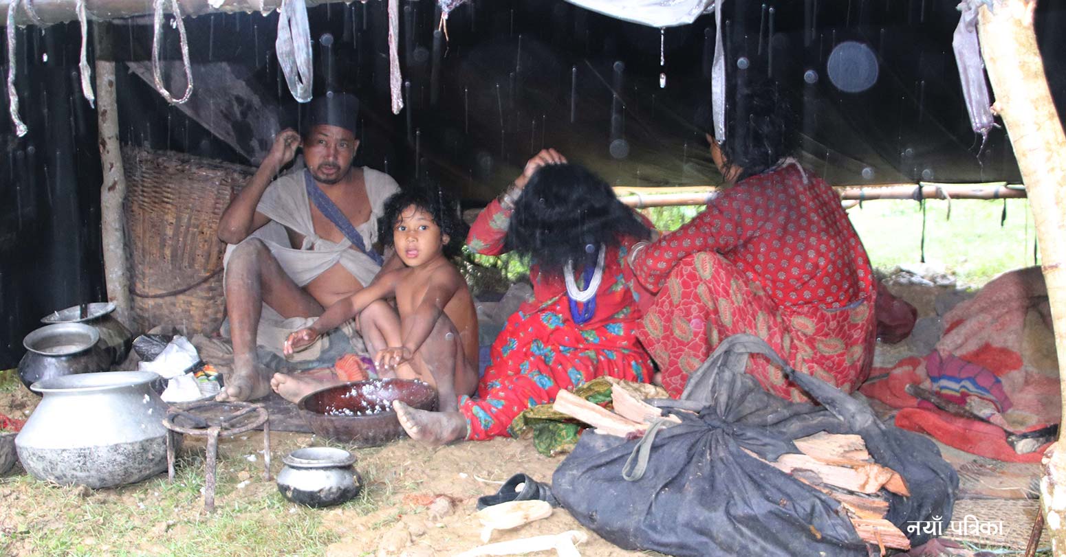 वर्षातको समयमा न त उचित बासको व्यवस्था छ नत राम्रो खानपान नै । जंगलमा भेटिएको कन्दमुल तथा अभावै अभावमा जेनतेन जीवन गुजारा गरीरहेको उनीहरुको गुनासो छ । राउटे खकेन्द्र बहादुर शाहीका अनुसार श्रीमती सुत्केरी भएको बेलामा समेत अन्यबेलाको जस्तै खाना खुवाउने गरेका छन् । ‘अहिले त छोरी ५ वर्षकी भइ श्रीमती सुत्केरी बेलामा पनि जडीबुटी खुवायौं,भात खुवायौं अरु त के खुवाउनु । अहिले चिसो बढ्न थाल्यो,कम्बलको आवश्यकता छ । चामल चार्हिएको छ । पाल चाहिएको छ ’ उनले भने ।