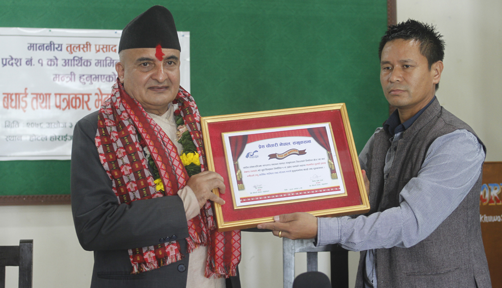 मन्त्री न्यौपानेलाई प्रेस चौतारी सङ्खुवासभाले सम्मान गर्दै । तस्बिरः ध्यान कुलुङ