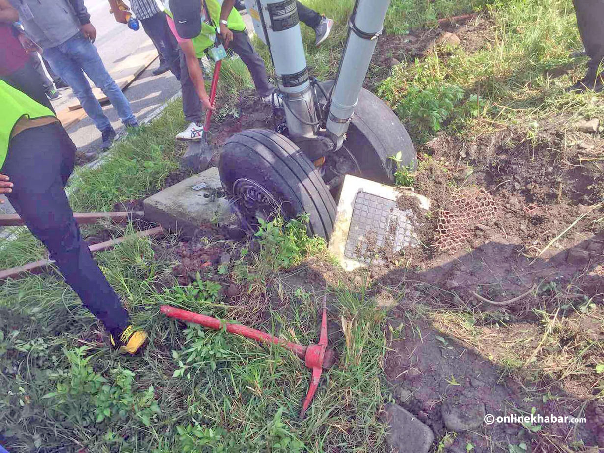 विमानस्थलका कर्मचारीहरुले गल, गैंती लगायतका उपकरण प्रयोग गरी धसिएको पाङ्ग्रालाई माथि उठाएर बाहिर निकाल्ने प्रयासमा जुटेका त्रिभुवन अन्तर्राष्ट्रिय विमानस्थलका महाप्रवन्धक प्रतापबाबु तिवारीले जानकारी दिए ।