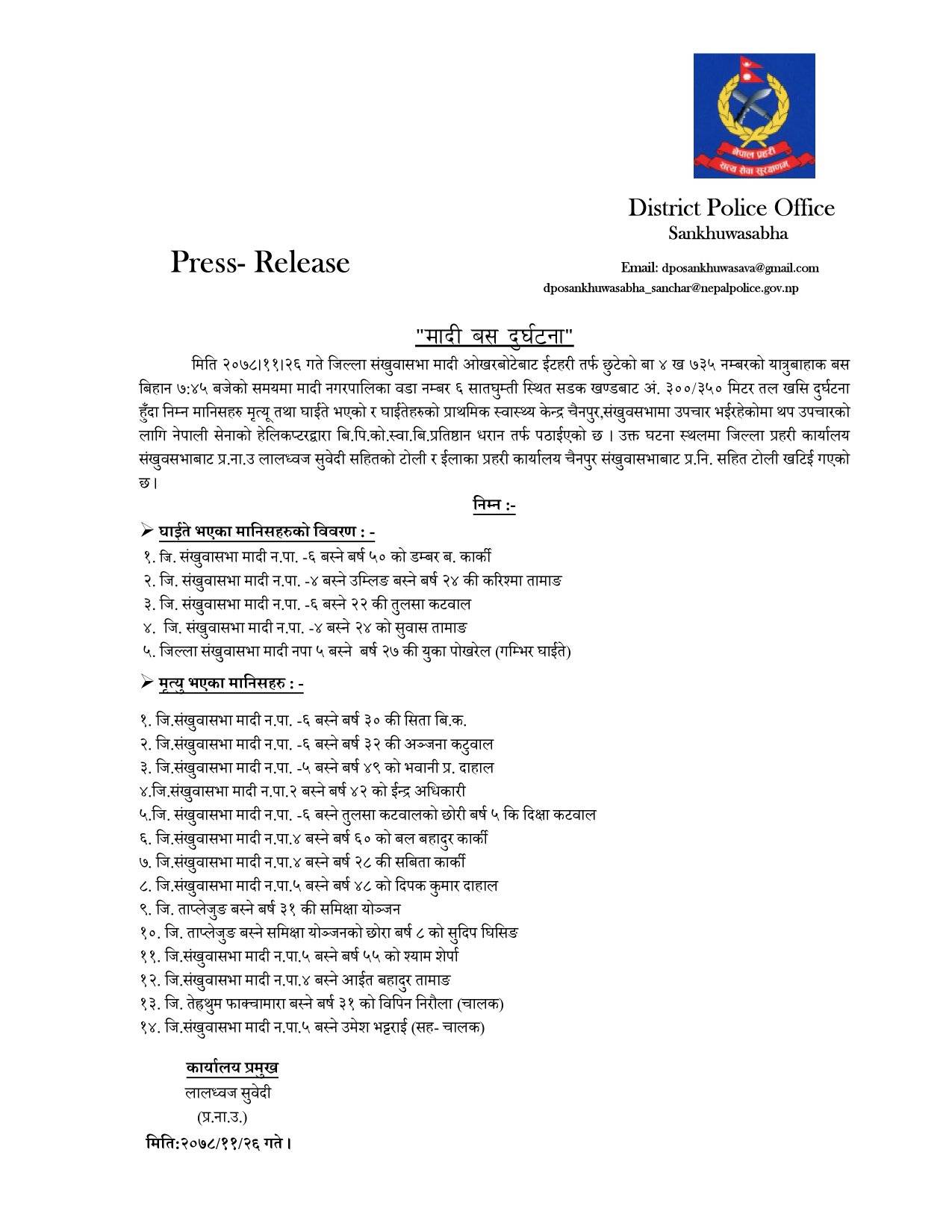 खाँदबारी । मादी नगरपालिका ६ मा भएको बस दुर्घटनामा पर्नेहरुको सनाखत भएको छ । मृत्यू हुने १४ र घाईते ५ जनाको सनाखत भएको हो । उक्त घटनामा परेकाहरुको बिवरण जिल्ला प्रहरी कार्यालय संखुवासभाले सार्वजनिक गरेको छ ।