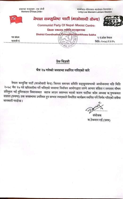 मौसमको प्रतिकलताका कारण नियमित हवाई उडान नभएको र निर्वाचन आचार संहिताका कारण हेलीकप्टरबाट उडान भर्न नमिल्ने भएको भन्दै कार्यक्रम स्थगित गरिएको आयोजक जिल्ला कार्य समितिले जनाएको हो ।