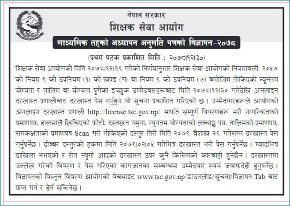 आयोगले जारी गरेको सूचनामा भनिएको छ, शिक्षक सेवा आयोगको मिति २०७८।१२।२९ गतेको निर्णयानुसार शिक्षक सेवा आयोगको नियमावली, २०५७ को नियम ९ को उपनियम (१) को खण्ड (ग) वा नियम ९ को उपनियम (७) बमोजिम तोकिएको न्यूनतम योग्यता र तालिम वा योग्यता पुगेका इच्छुक उम्मेदवारहरूबाट मिति २०७८/१२/३० गतेदेखि अनलाइन दरखास्त प्रणालीबाट दरखास्त पेस गर्नुहुन यो सूचना प्रकाशित गरिएको छ ।