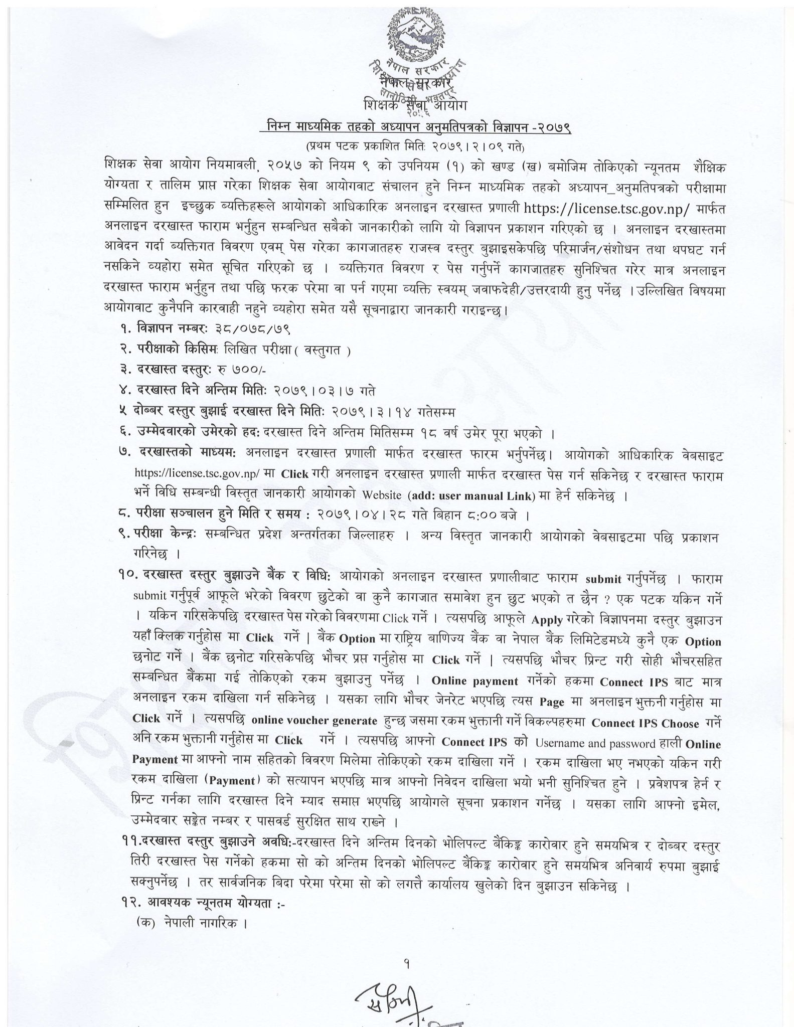 आयोगले तोकिएको न्यूनतम शैक्षिक योग्यता र तालिम पुगेका इच्छुक उम्मेद्वारहरूले आज (जेठ ९ गते सोमबार) देखि असार ७ गते सम्म अनलाइन दरखास्त दिन सकिनेछ । दोब्बर दस्तुर तिरेर १४ गतेसम्म आवेदन दिन सकिने आयोगको सूचनामा उल्लेख छ ।