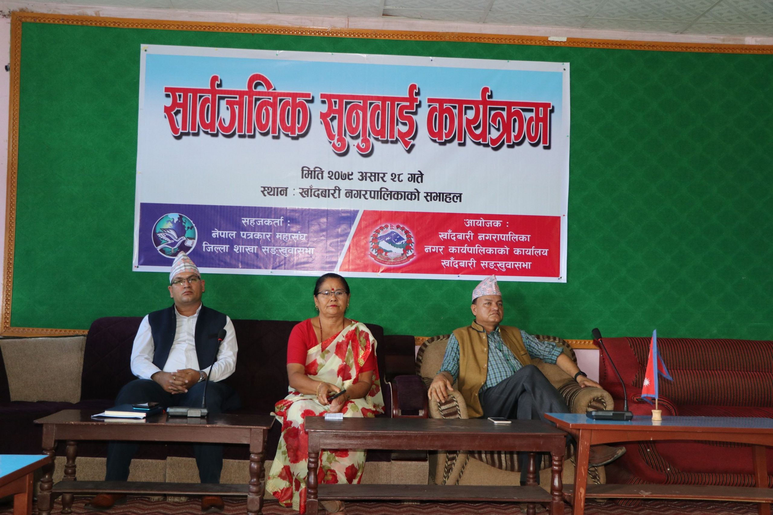 संखुवासभाको खाँदबारी नगरपालिकाले आर्थिक बर्ष २०७८/०७९ को बार्षिक बजेट तथा प्रगति बिवरण सम्वन्धी सार्वजनिक सुनुवाई कार्यक्रम सम्पन्न गरेको छ । यस आर्थिक बर्षमा खाँदबारी नगरपालिकाको सभाहलमा सम्पन्न कार्यक्रमको व्यवस्थापन नेपाल पत्रकार महासंघ जिल्ला शाखा संखुवासभाले गरेको थियो । मंगलबार सम्पन्न कार्यक्रममा विभिन्न वडाका स्थानीय, सेवा प्रदायक संस्था खाँदबारी नगरपालिकाका प्रमुख, उपप्रमुख लगायत कर्मचारीहरुको उपस्थिति रहेको थियो ।