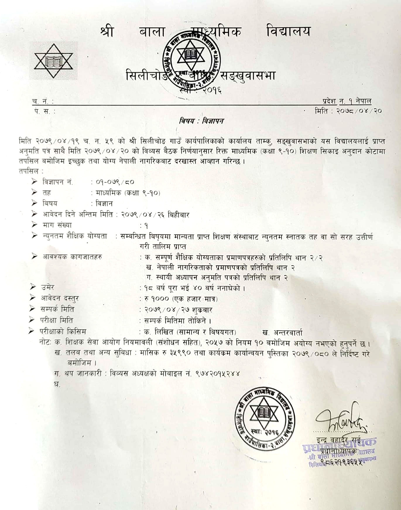 सिलिचाेङ २ स्थित बाला माबिमा आधारभुत तहकाे शिक्षक आवश्यकता (बिज्ञापन)
