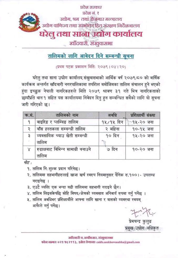 घरेलु तथा साना उद्याेग कार्यालय संखुवासभाबाट सिपमुलक तालिम दिईने बारे सुचना (विज्ञापन)