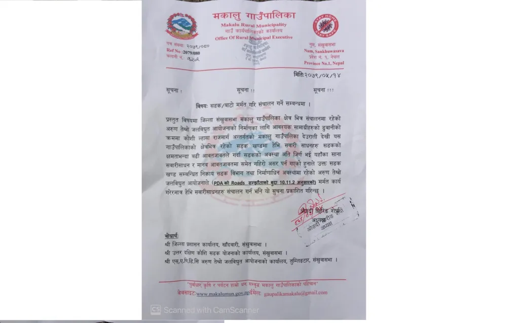 संखुवासभा । संखुवासभामा निर्माणाधिन ९०० मेगावाटको अरुण तेस्रो आयोजना स्थल जाने सडक अन्तर्गत मकालु गाउँपालिका सडक खण्ड आज (मंगलबार) बाट बन्द गरेको छ । गाउँपालिकाले सूचना जारी गर्दै गाउँपालिका क्षेत्रमा ठुला मालवहाक सवारी साधन आवत जावतमा रोक लगाएको हो ।