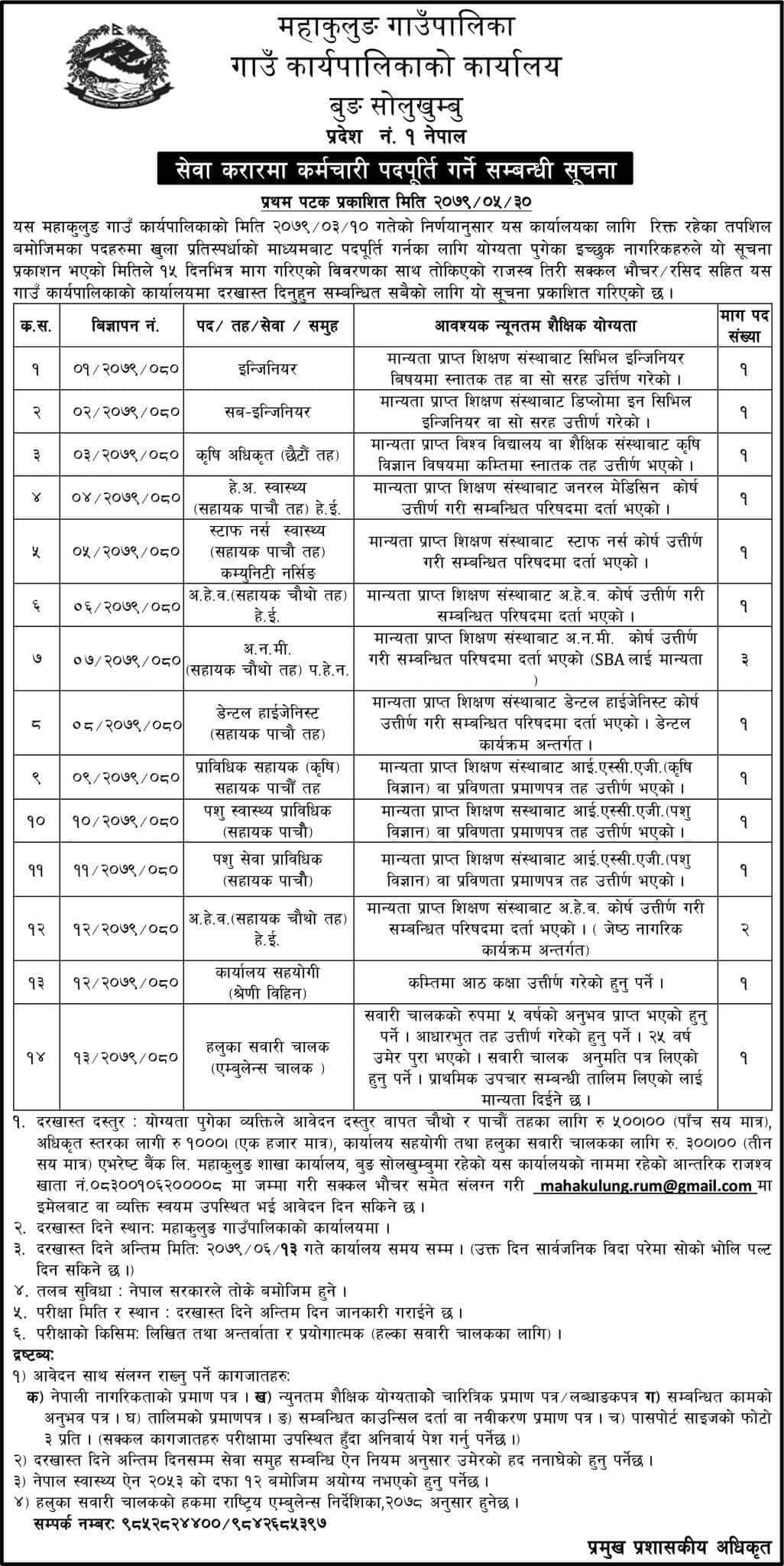 प्राविधिक शाखा, कृषी तथा पशु शाखा, स्वास्थ्य शाखा, कार्यालय सहयोगी र हलुका सवारी चालकको माग गरेको हो । गाउँपालिकामा केहि रिक्त रहेको पदमा तथा केहि थप जनशक्ति आवश्यक परेकोले नयाँ विज्ञापन गरिएको गाउँपालिकाले जनाएको छ ।