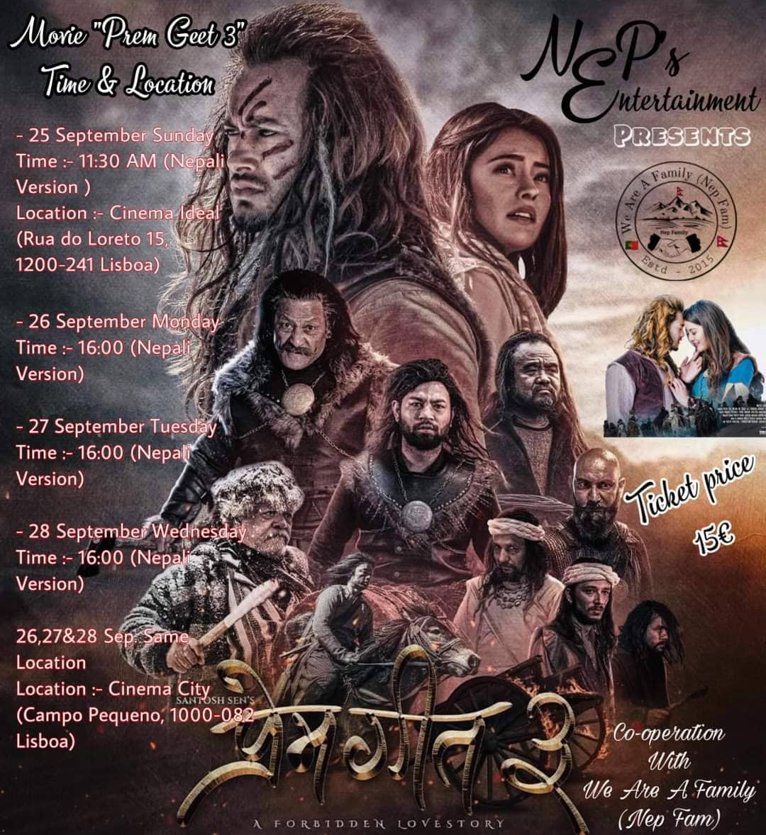 लिस्बन । बहुप्रतिक्षित चलचित्र ‘प्रेमगीत ३’ को नेपाली संस्करण पोर्चुगलको लिस्बनमा प्रदर्शन शुरु भएको छ ।