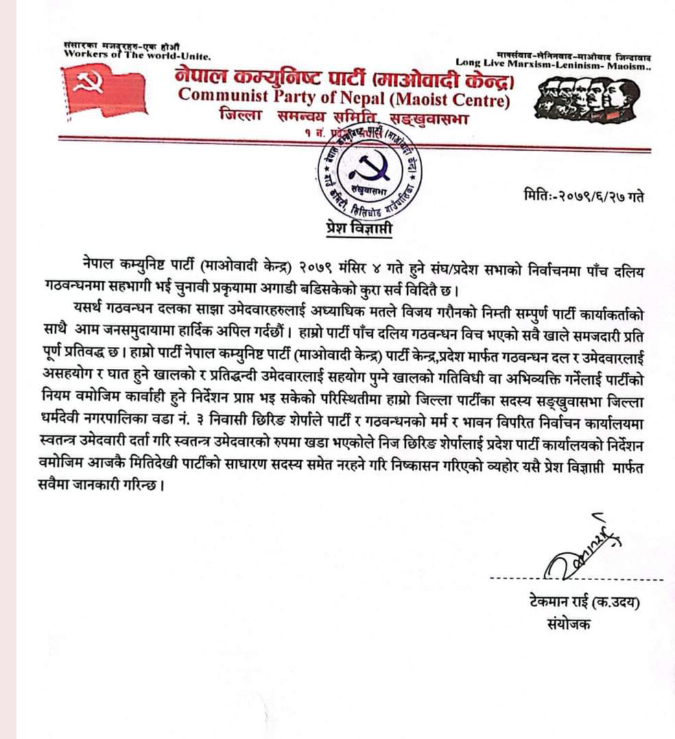माओवादी केन्द्रका जिल्ला संयोजक टेकमान राई (उदय)ले बुधबार विज्ञप्ति जारी गर्दै पार्टीको हित तथा गठबन्धनको भावना र मर्मविपरीत उम्मेदवारी दिएकाले साधारण सदस्यसमेत नरहने गरी कारबाही गरेको जनाएका छन्।