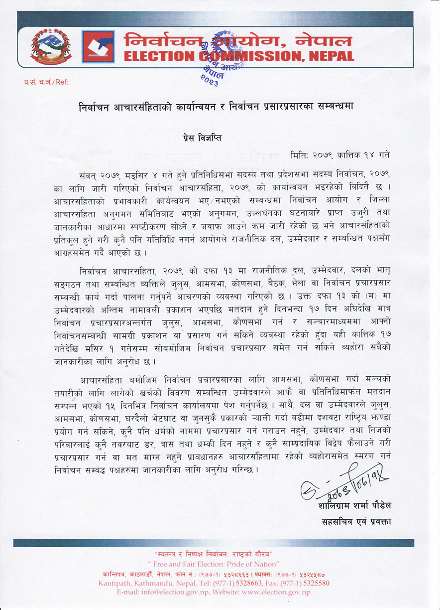 उक्त दफा १३ (म) मा उम्मेदवारको अन्तिम नामावली प्रकाशन भएपछि मतदान हुने दिनभन्दा १७ दिनअघिदेखि मात्र निर्वाचन प्रचारप्रसारअन्तर्गत जुलुस, आमसभा, कोणसभा गर्न र सञ्चारमाध्यममा आफ्नो निर्वाचनसम्बन्धी सामग्री प्रकाशन वा प्रसारण गर्न सकिने व्यवस्था गरिएको आयोगका प्रवक्ता शालिग्राम शर्मा पौडेलले आज जारी गरेको विज्ञप्तिमा उल्लेख छ ।