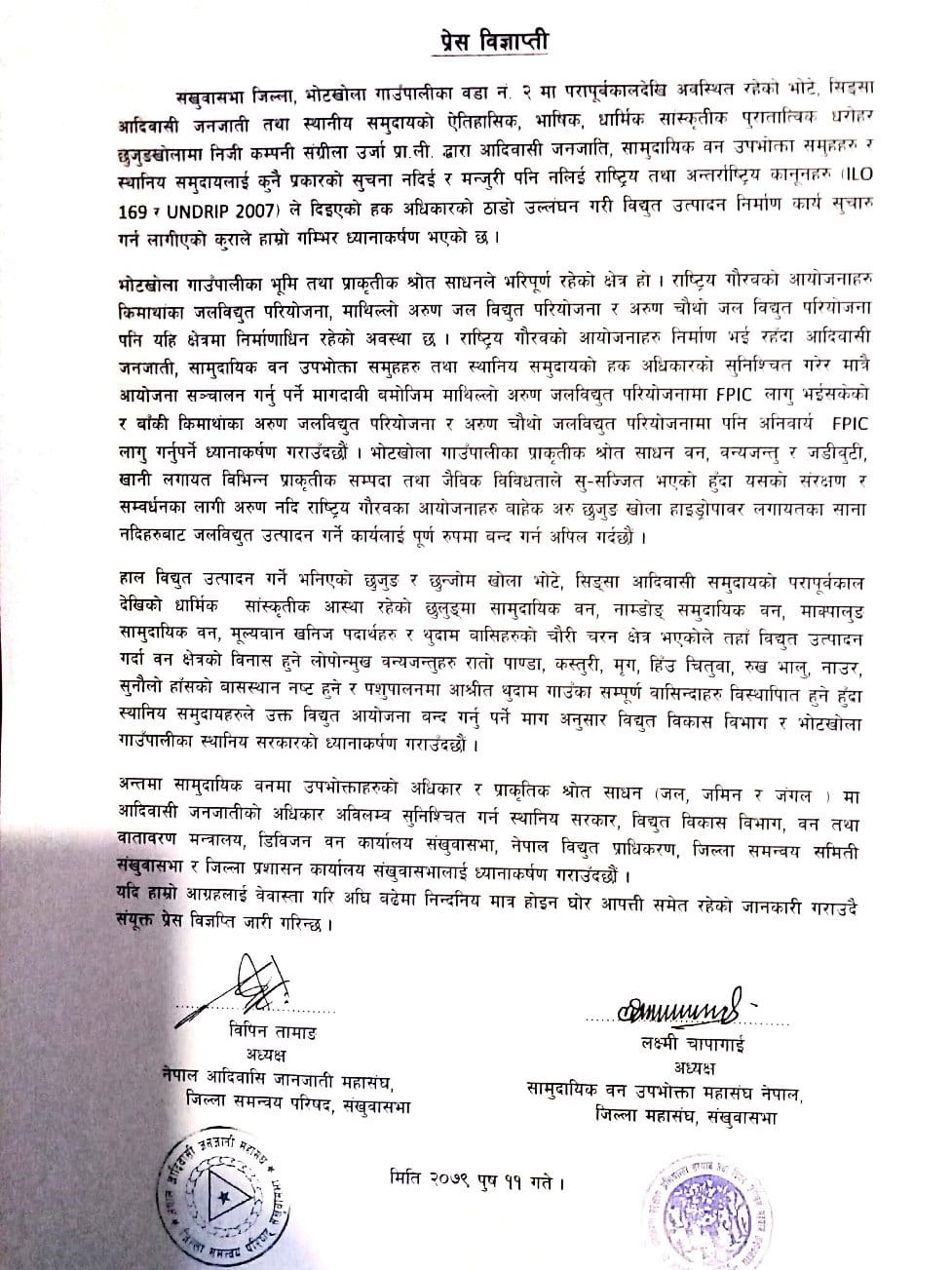 हेर्नुहाेस जनजाती महासंघ संखुवासभा र फेकाेफाेनले जारी गरेकाे विज्ञप्ति ।