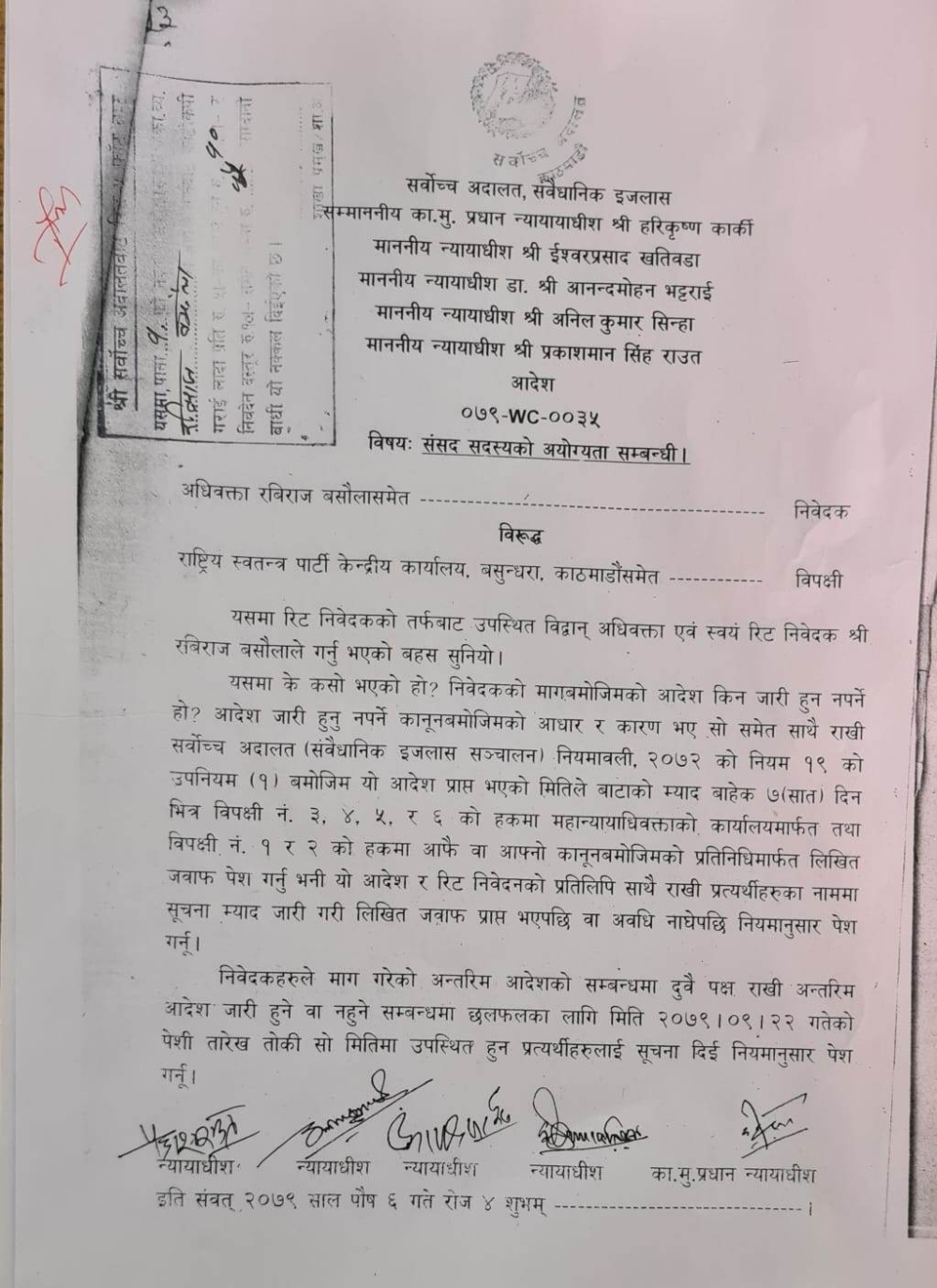 युवराज बसौला र अधिवक्ता युवराज भट्टराईले छुट्टाछुट्टै रिट दायर गरी लामिछानेको नेपाली नागरिकता रद्द भइसकेको अवस्थामा रास्वपाका सभापति पद, साधारण सदस्यता तथा निर्वाचनका प्रक्रिया बदर गर्न माग गर्नुभएको थियो ।
