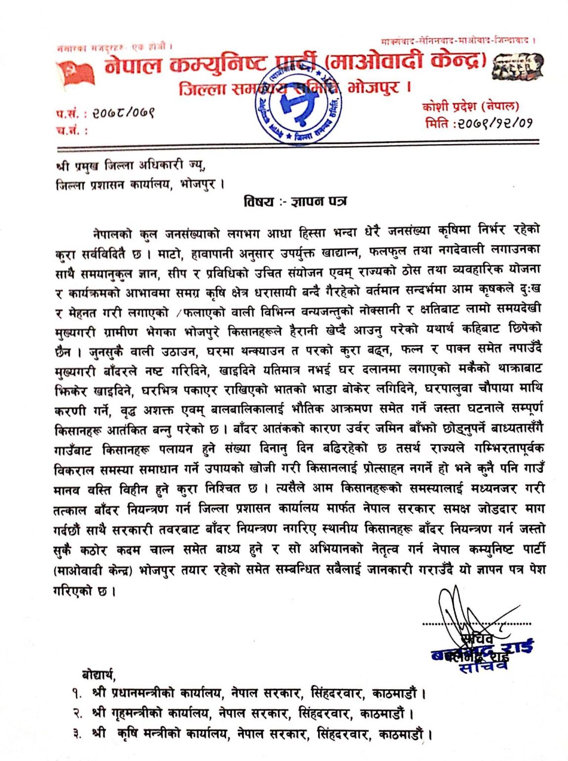 जिल्ला समन्वय समितिका सचिव बलभद्र राईसहित प्रशासन पुगेका माओवादीका जिल्ला नेताले सरकारी तवरबाट बाँदर नियन्त्रण नगरिए स्थानीय किसानहरू बाँदर नियन्त्रण गर्न जस्तो सुकै कठोर कदम चाल्नसमेत बाध्य हुने र त्यसको नेतृत्व आफ्नो पार्टीले गर्ने भन्दै ध्यानाकर्षण गराइएको छ । ‘आम कृषकले दुःख र मेहनत गरी लगाएको र फलाएको बाली विभिन्न वन्यजन्तुको नोक्सानी र क्षतिबाट लामो समयदेखि मुख्यगरी ग्रामीण भेगका भोजपुरे किसानहरूले हैरानी खेप्दै आउनु परेको यथार्थ कहिबाट छिपेको छैन । जुनसुकै बाली उठाउन, घरमा थन्क्याउन त परको कुरा बढ्न, फल्न र पाक्न समेत नपाउँदै मुख्यगरी बाँदरले नष्ट गरिदिने, खाइदिने यतिमात्र नभई घर दलानमा लगाएको मकैको थाक्राबाट झिकेर खाइदिने, घरभित्र पकाएर राखिएको भातको भाडा बोकेर लगिदिने, घरपालुवा चौपायामाथि करणी गर्ने, वृद्ध अशक्त एवम् बालबालिकालाई भौतिक आक्रमण समेत गर्ने जस्ता घटनाले सम्पूर्ण किसानहरू आतंकित बन्नु परेको छ’, बाँदरले दिएको दुःख विज्ञप्तिमा उल्लेख छ । माओवादीले ज्ञापनपत्रमार्फत प्रधानमन्त्री, गृहमन्त्री र कृषिमन्त्रीको ध्यानाकर्षण गराएको छ ।