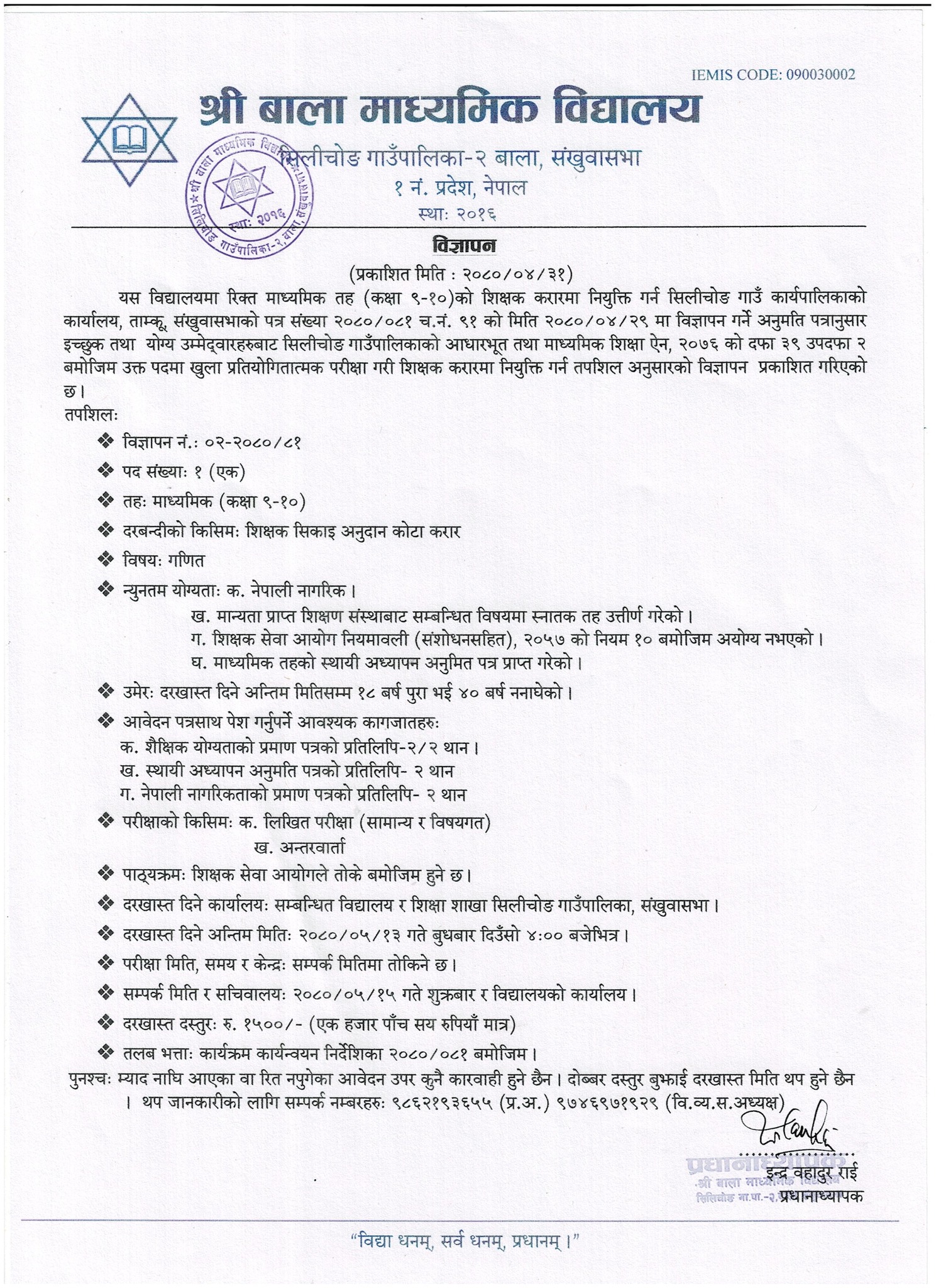सिलिचाेङ गाउँपालिका २ बालामा रहेकाे बाला माध्यमिक विद्यालयले माध्यमिक तहकाे गणित विषयमा दर्खास्त आव्हान गरेकाे छ । हेराैं प्रकाशित सुचना ।