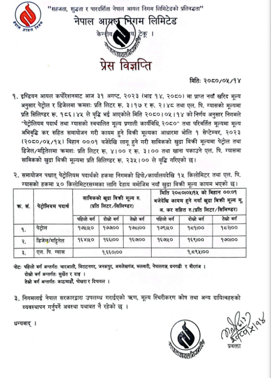 नेपाल आयल निगमले पेट्रोलियम पदार्थ तथा ग्यासको स्वचालित मूल्य प्रणाली कार्यविधि, २०८० तथा परिवर्तित मूल्यमा मूल्य अभिवृद्धि दर सहित समायोजन गरि कायम गरिएको जनाएको छ ।