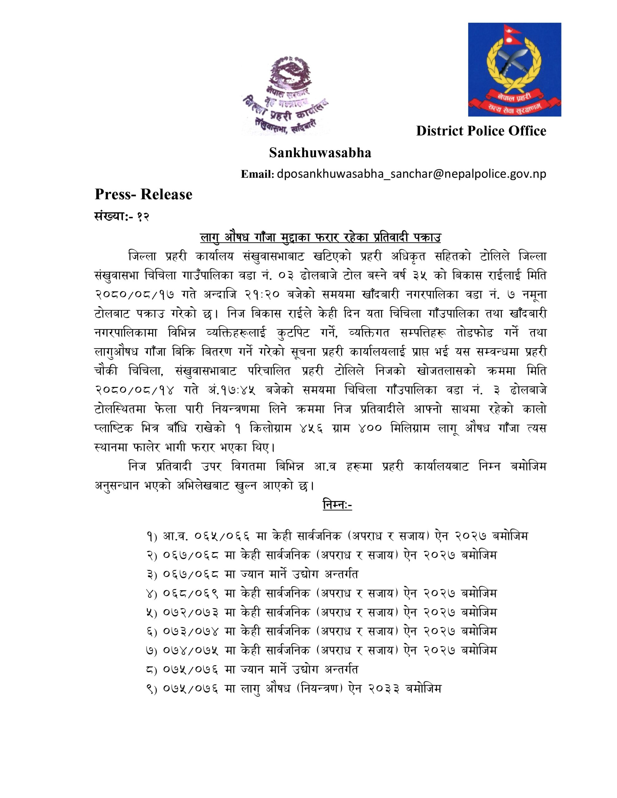 विकास राई पक्राउ परेकाे विषयमा जिल्ला प्रहरी कार्यालय सङ्खुवासभाले जारी गरेकाे प्रेस विज्ञप्त यहाँ राखिएकाे छ ।