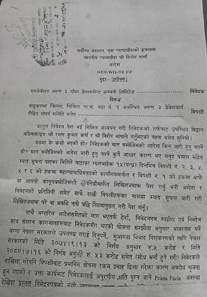 एसजेभिएन अरुण ३ पावर डेभलप्मेन्ट कम्पनी लिमिटेडले चिचिला गाउँपालिका स्थित अरुण ३ प्रवेश मार्ग पिडित संघर्ष समिति विरुद्ध हालेकाे मुद्धाकाे सुनुवाई गर्दै सर्वाेच्च अदालतले यस्ताे आदेश जारी गरेकाे हाे । अरुण ३ काे तर्फबाट अधिबक्ताद्वय रमण कुमार कर्ण र विशेष थापाले गरेकाे बहसकाे सुनुवाई गर्दै न्यायधिस विनाेद शर्माले यस्ताे आदेश दिएका हुन् ।