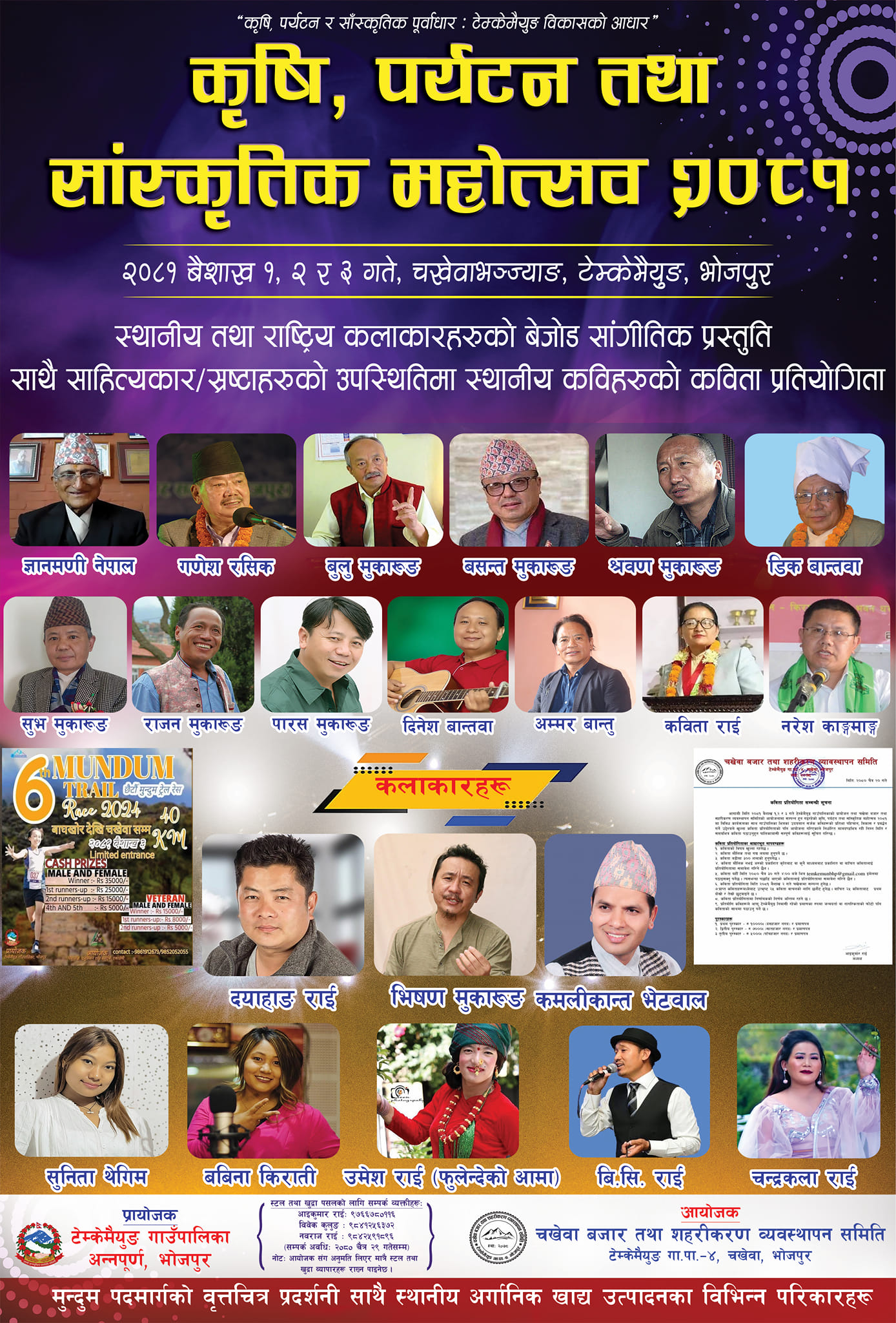 टेम्केमैयुम गाउँपालिकाको सहयेगमा चखेवा बजार तथा शहरीकरण व्यवस्थापन समितिको आयोजनामा वैशाख १–३ सम्म कृषि पर्यटन तथा सांस्कृतिक महोत्सव सञ्चालन गरिने आयोजक समितिका बिवेक कुलुङले जानकारी दिएका छन् ।