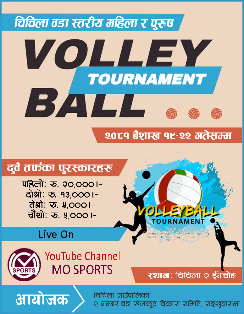 खाँदबारी । चिचिला गाउँपालिका २ नम्बर वडा खेलकुद विकास समितिकाे आयाेजनामा भलिबल प्रतियाेगिता हुने भएकाे छ । बैशाख १९ बाट चिचिला गाउँपालिका भित्रका वडा स्तरीय महिला र पुरुष भलिबल प्रतियाेगिता हुने भएकाे हाे ।