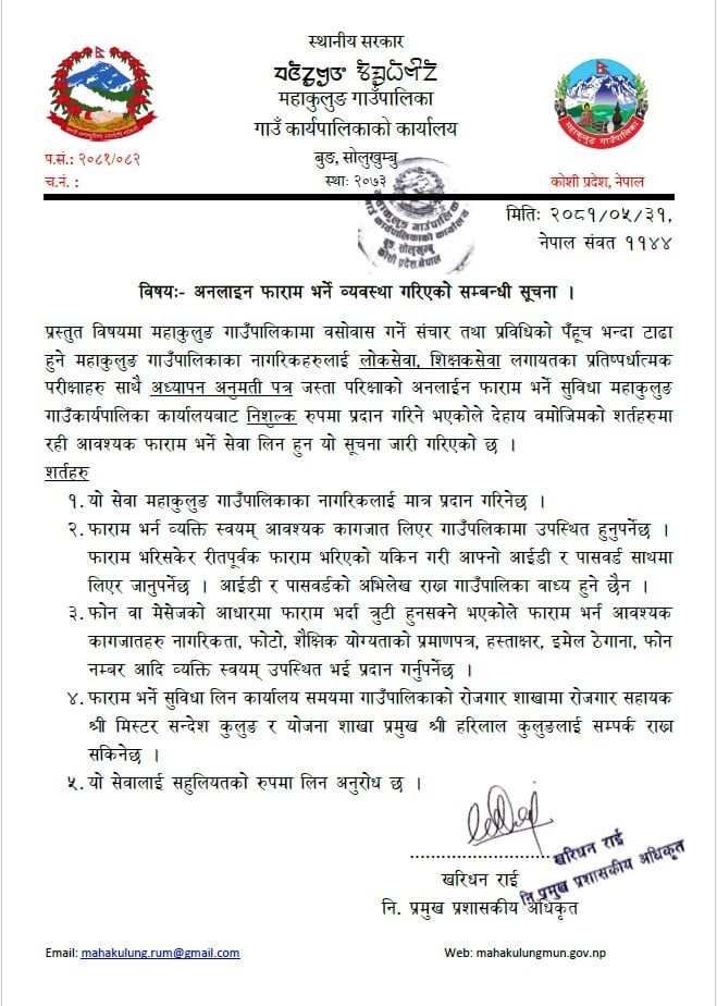 खाँदबारी । साेलुखुम्बुकाे महाकुलुङ गाउँपालिकाले सरकारी सेवा प्रवेशका लागि परिक्षा फारम निशुल्क भरिदिने ब्यवस्था गरेकाे छ । विभिन्न आयाेग र अनुमति पत्र (लाईसेन्स) काे परिक्षामा सामेल हुनका लागि ईच्छुक पालिकावासीहरुकाे निशुल्क फारम भरिदिने ब्यवस्था गरेकाे हाे ।