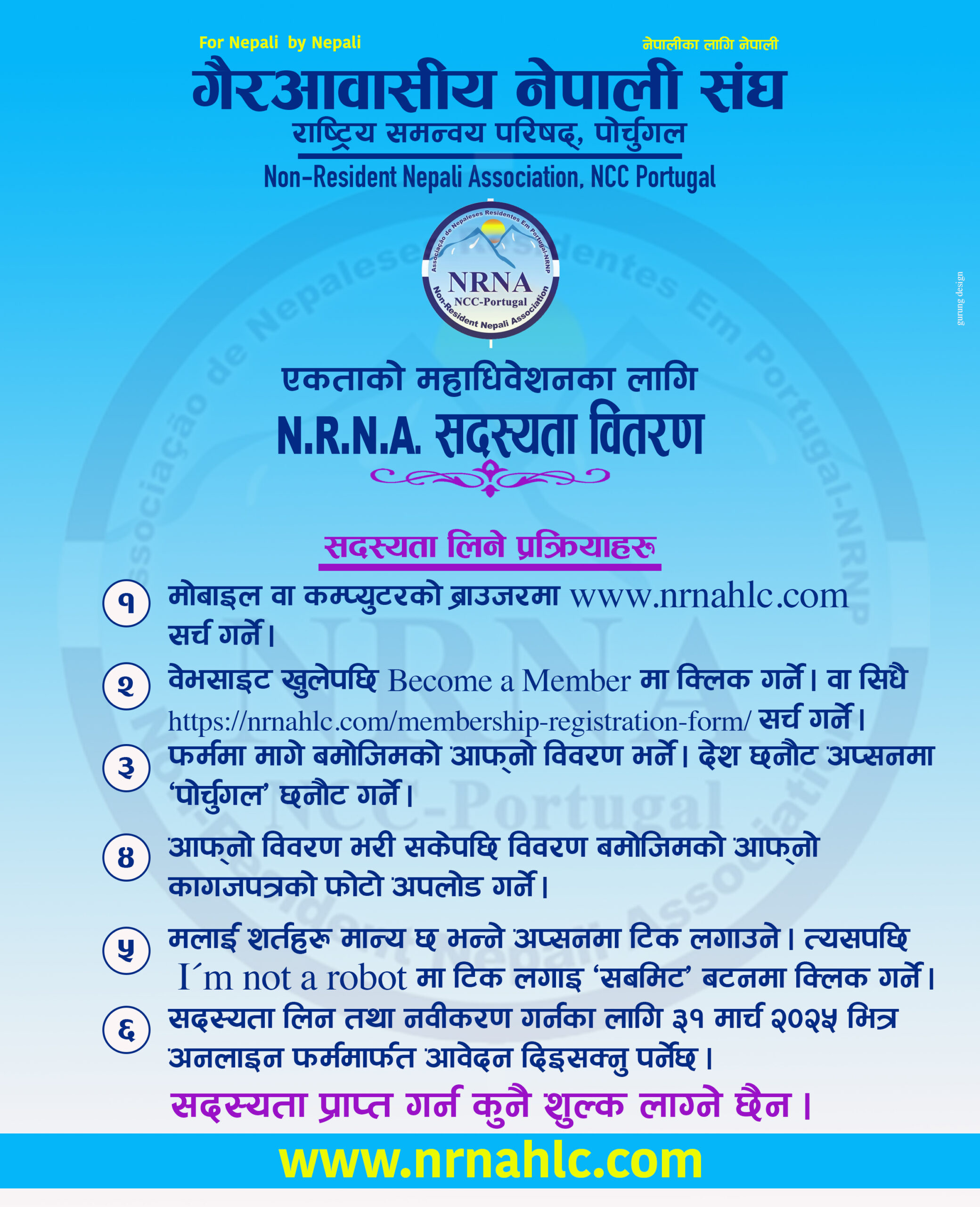 उच्चस्तरीय समितिले यसअघि नै अनलाइन मार्फत सदस्यता खुला गरिसकेको छ । आगामी मार्च ३१ सम्म सदस्यताका लागि आवेदन दिन सक्ने पोर्चुगलकी अध्यक्ष दीपा काफ्लेले जानकारी दिनुभयो । यस पटक सदस्यता निशुल्क भएको पनि काफ्लेले जानकारी दिइन् । सदस्यता www.nrnahlc.com बाट लिन सक्नेछ ।