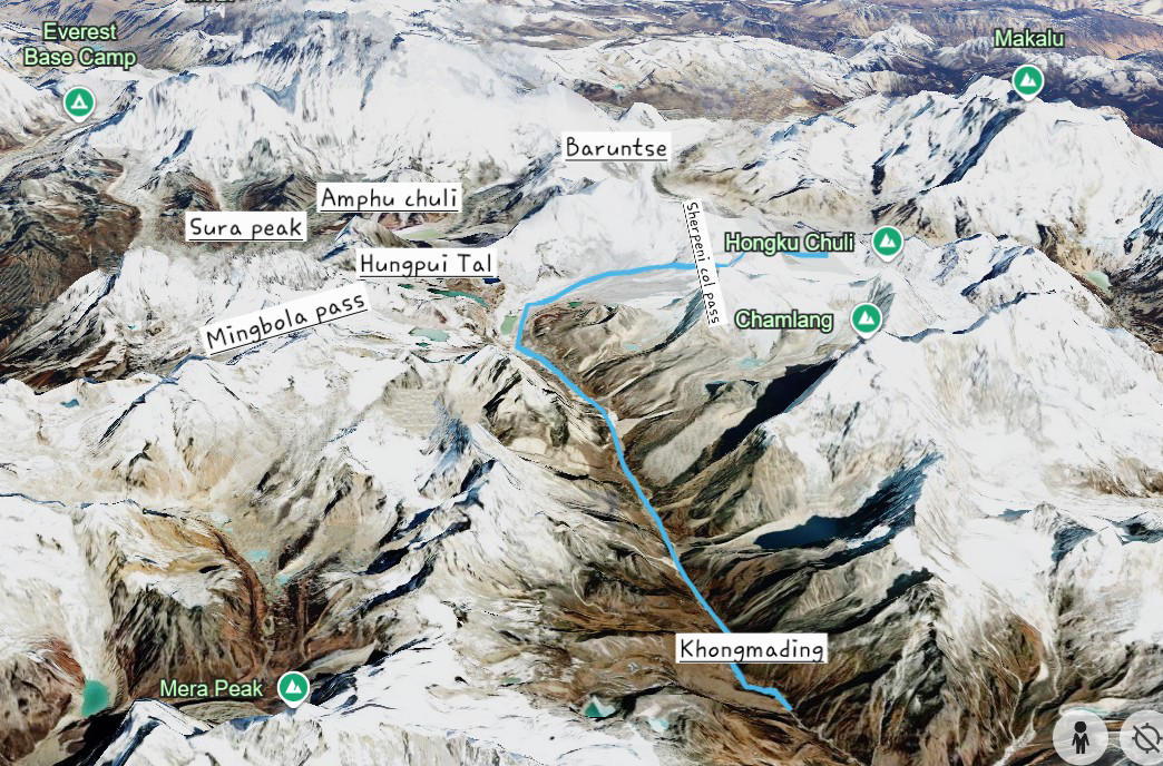 खोङमादिङबाट उत्तरतिर फर्केर बाँयातिर हेर्दा नजिकै ६,४७६ मिटर उचाईको मेरापिक रहेको छ । हुंङगु उपत्यका र इङखु उपत्यकाको बिचमा रहेको यो हिमाललाई सन् २०१९ को सरकारी तथ्यांङक अनुसार १७२८ जनाले चढेका थिए । यही हिमालको आधारशिविर भएर मेराला हुदै इङखु उपत्यकाबाट हुंङगु उपत्यका प्रवेश गरिन्छ । मेरा हिमालदेखि घडीको सुईको दिशामा बाँया माथितिर मिङबोला पास (५८४५मि) रहेको छ । खोङमादिङ उपत्यकाबाट खुम्बु उपत्यका निस्कन यो मार्ग पनि प्रयोग गर्न सकिन्छ ।