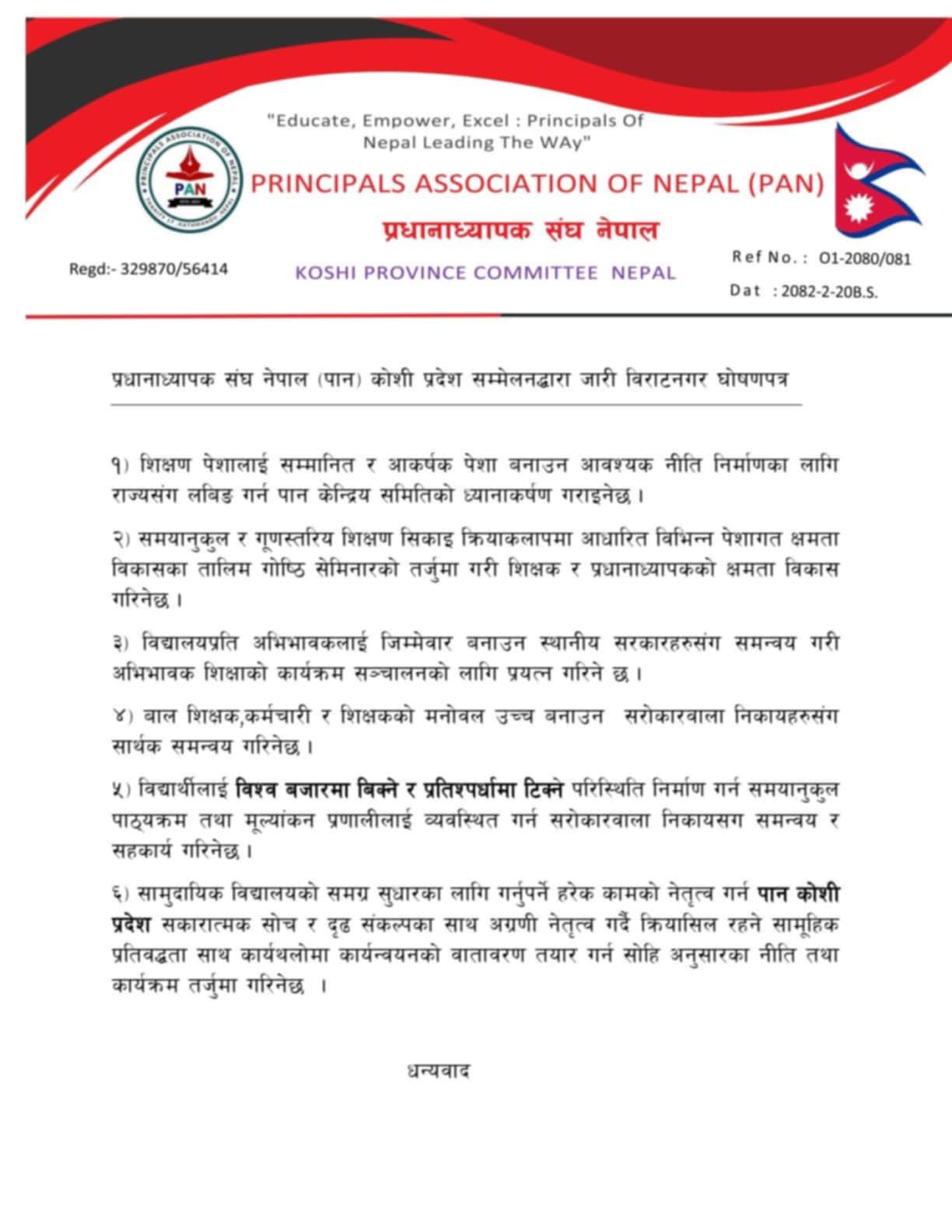 बिराटनगर । प्रधानाध्यापक संघ नेपाल (पान) को दोश्रो कोशी प्रदेश सम्मेलन ६ बुदेँ बिराटनगर घोषणा पत्र जारी गर्दै सम्पन्न भएको छ ।