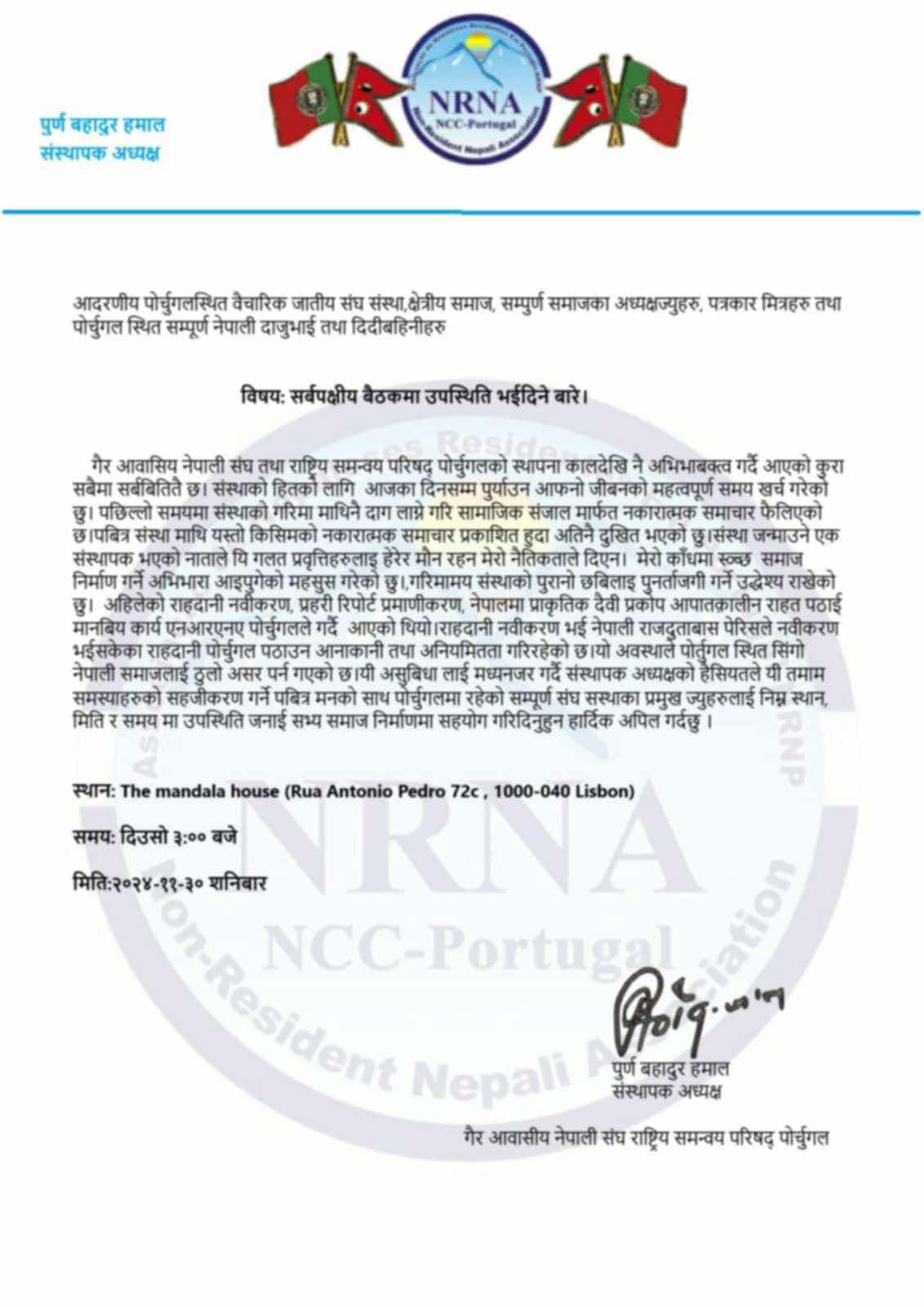 लिस्बन। यतिखेर सामाजिक सञ्जालमा हेर्ने हो भने गैरआवासीय नेपाली संघ, पोर्चुगलको आधा दर्जन फेसबुक आइडी देख्न सकिन्छ । पछिल्लोपटक संघभित्र देखिएको विभाजन नै यसको कारण हो । पोर्चुगलमा राष्ट्रिय समन्वय परिषद नै तिनवटा गठन भएका छन् । हाल बमबहादुर जिसि, दीपा काफ्ले र सुजन लामाले आ-आफ्नै अध्यक्षतामा समिति रहेको दाबी गरेका छन् । त्यसो त केन्द्रमा पनि महेश श्रेष्ठ र बद्री केसीको दुई वटा समितिहरु रहेका छन् । दुबैले आ-आफू आधिकारिक भएको दाबी गरेका छन् । यसैको असर पनि पोर्चुगलमा परेको छ ।