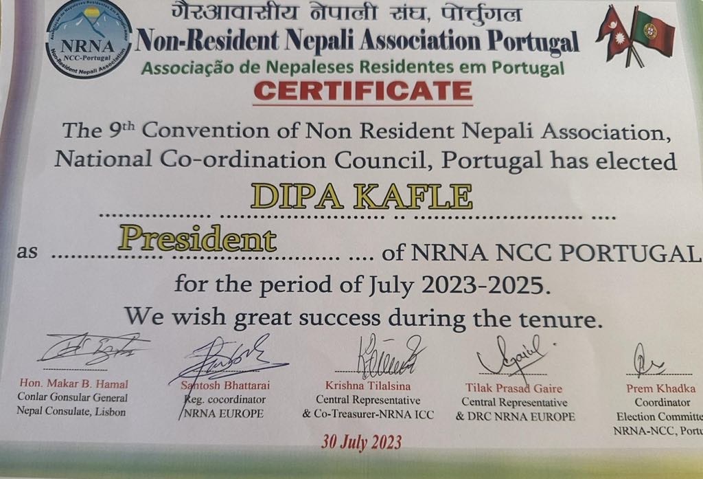 महाधिवेशनको बन्दशत्रले सहमतिको आधारमा उमेश खड्का र दीपा काफ्लेलाई एक-एक वर्ष कार्यकाल बाँडेर अध्यक्षता चलाउने गरी निर्वाचित गरेको थियो । बन्दशत्रमा नै पहिलो वर्ष उमेश खडकाले नेतृत्व लिने र उक्त समयमा दीपा काफ्ले वरिष्ठ उपाध्यक्ष रहने निर्णय गरिएको थियो । दोश्रो वर्ष दीपा काफ्लेले अध्यक्षता सञ्चालन गर्ने निर्णय पनि पारित भयो । निर्वाचित भएको प्रमाणपत्र वितरण गर्दा पनि दुबै जनालाई अध्यक्ष पदमा निर्वाचित भएको प्रमाण पत्र दिइयो । प्रमाणपत्रमा निर्वाचन समितिका संयोजक प्रेम खड्कासहित संघका केन्द्रीय प्रतिनिधिहरु, क्षेत्रीय संयोजक तथा पोर्चुगलका लागि तत्कालीन अवैतनिक महावाणिज्यदूतले हस्ताक्षर गरेका छन् ।