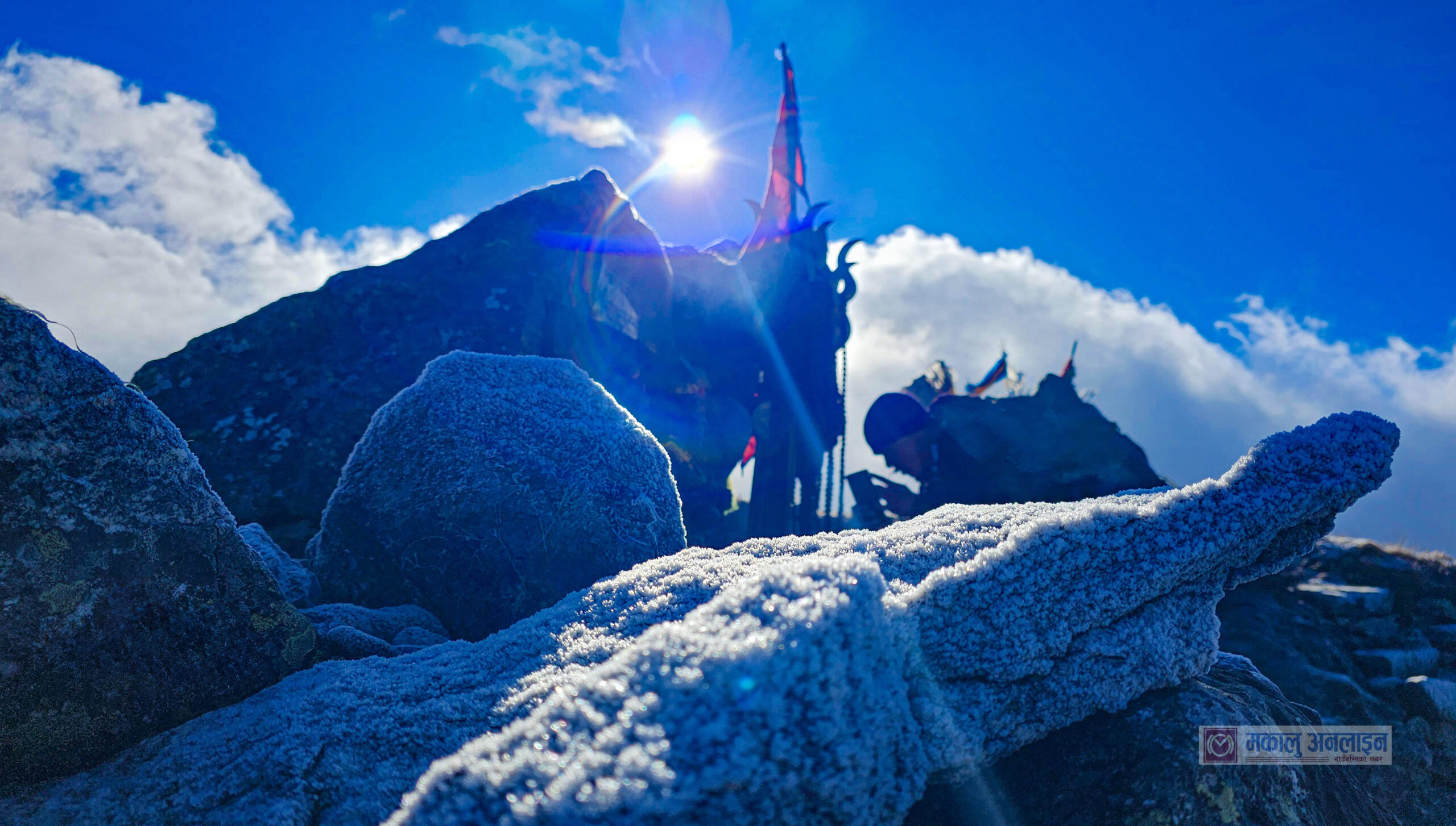 सिलिछो (सिलिचोङ) टपमा परेको तुसारो, पृष्ठभुमिमा सुम्निमा पारुहाङको प्रतिमा ।