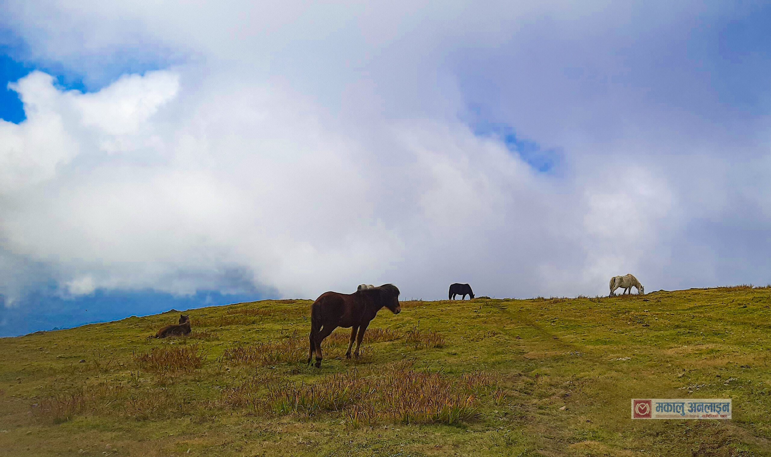 मैयुम क्षेत्रमा पालिएको घोडा, यहाँ मनोरञ्जनका लागि घोडा चढ्न पाईन्छ ।