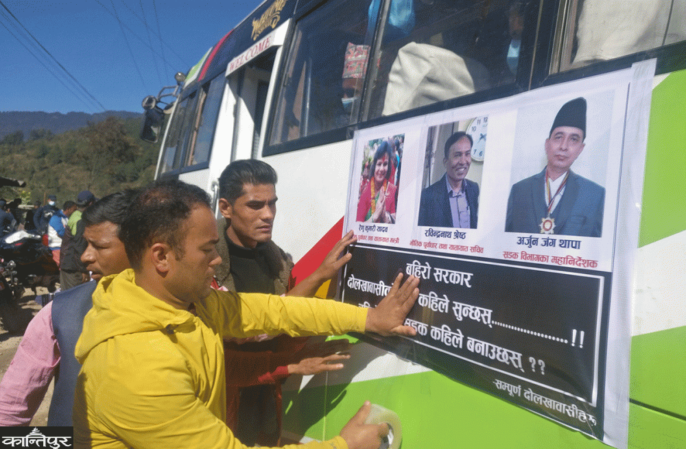 सडक नबनाएको भन्दै सवारीसाधनमा मन्त्री र कर्मचारीको फोटो टाँसेर विरोध